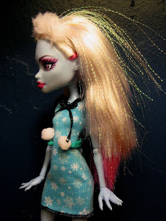 She has the standard Abbey hair -- white, tinseled, with blue, purple, and pink streaks underneath. As always, the tinsel is giving me problems by refusing to stay down. Compounding the problem is that there's one rooted clump in particular that is especially thick and sticks out like crazy. I'm probably gonna have to tweeze it. Really though, all of the tinsel on this particular Abbey doll is whackadoodle. It feels coarser than usual and several pieces have bends in them making them stick out even more. But like I said, I really like this doll. I guess it's amazing what a nice faceup can do.